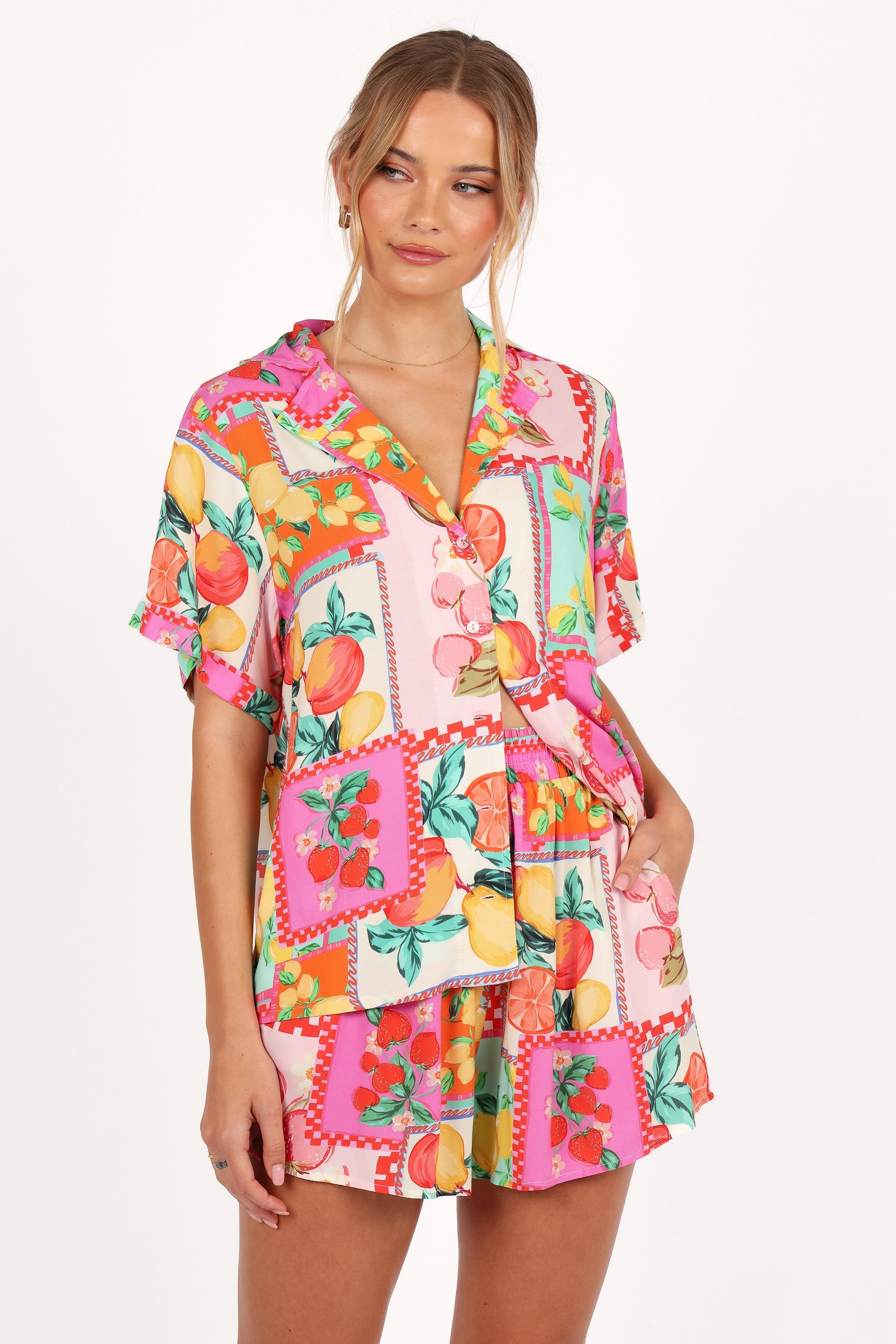 Heading on vacation? This top and shorts set is perfect for making a statement while relaxing in the sun! The top features a v neckline. spread collar. short sleeves. and functional button down front.