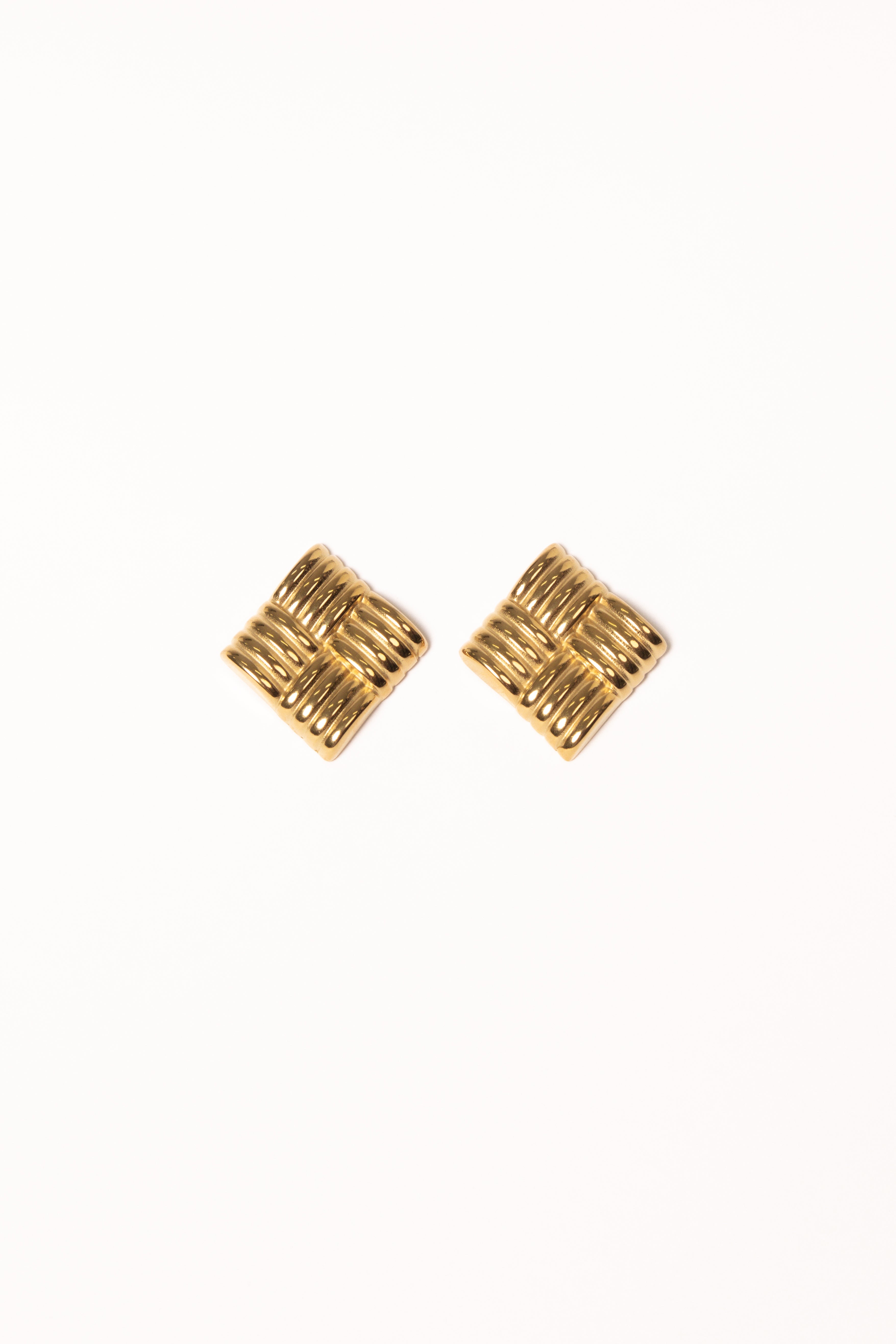Elevate your everyday look with the effortlessly chic Rinna Earrings in Gold. Featuring a bold. large square design with an intricately woven texture. these earrings are a modern twist on a timeless statement piece.