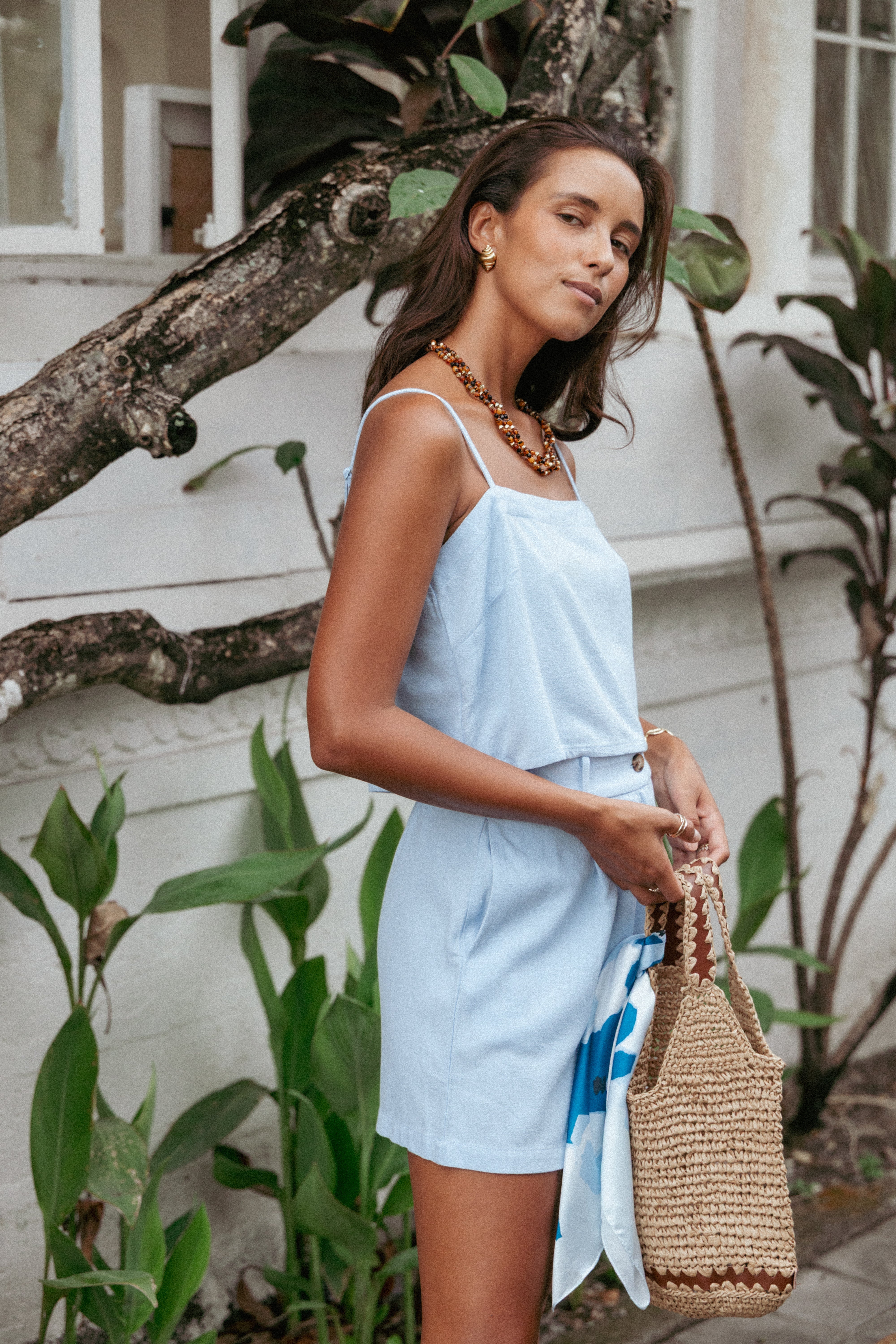 This playful and fashion-forward shorts set is perfect for any occasion. Featuring a cropped length top with a square neckline. thin adjustable straps. High rise shorts with a front fly close with button. will have you styling on the streets!