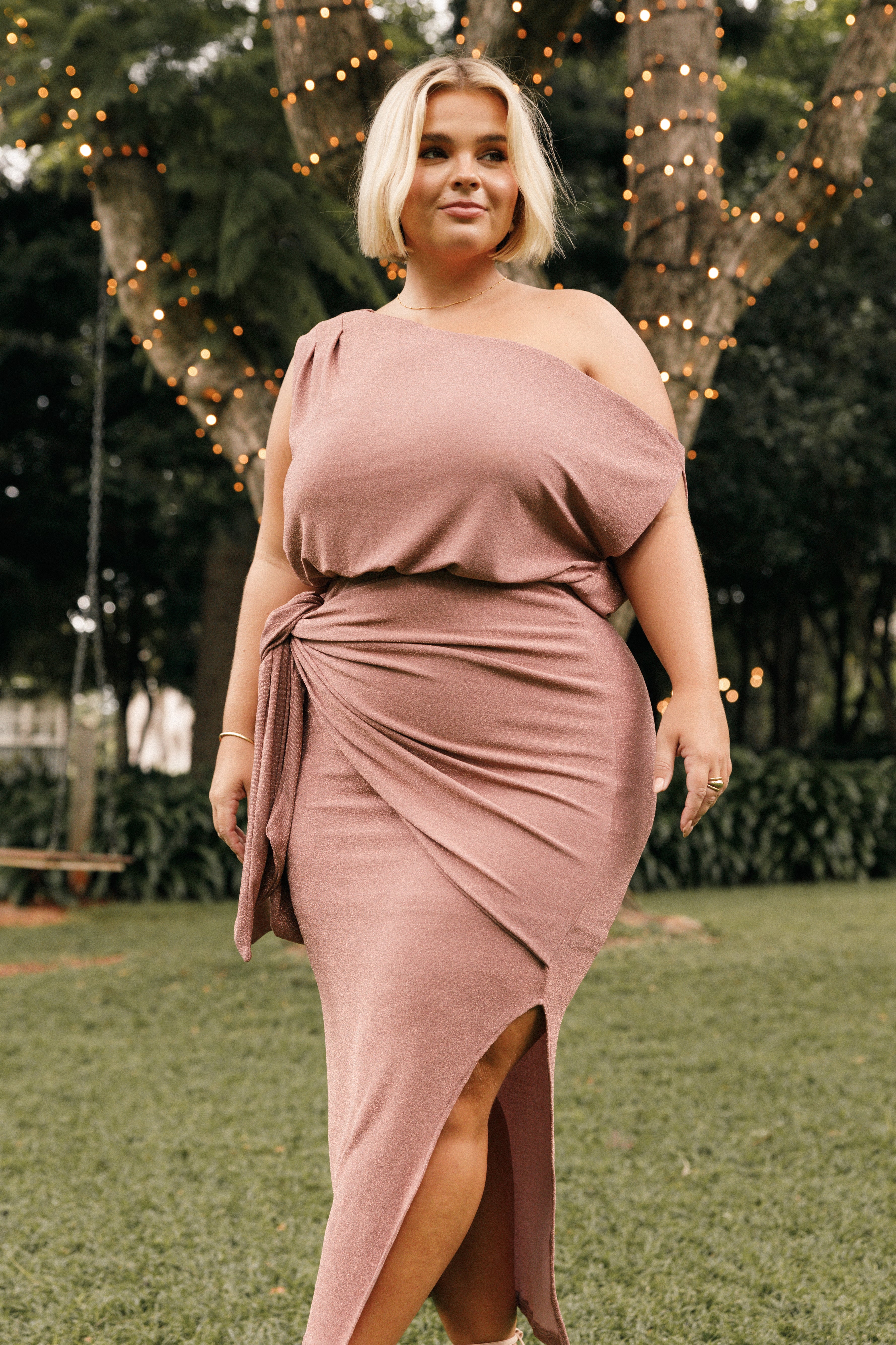 This season. it's all about the perfect midi dress! Look no further than this gorgeous off shoulder style in a sleek dusty rose glitter material. With an asymmetric neckline. sleeveless design and attached waist tie. you'll be able to flaunt your figure and look sharp all summer long.